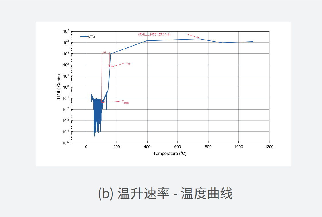 電池絕熱量熱儀(Battery Accelerating Calorimeter)在鋰電池單體熱失控測試中,能夠精準(zhǔn)測量鋰電池的自放熱起始溫度(Tonset)、熱失控起始溫度(TTR)、熱失控最高溫度(Tmax)、泄壓溫度(Tv)、最大升溫速率((dT/dt)max)和熱失控孕育時(shí)間(?t)等關(guān)鍵參數(shù)。為電池?zé)峁芾硐到y(tǒng)的設(shè)計(jì)提供數(shù)據(jù)支持,助力研究人員明確鋰電池的安全邊界,實(shí)現(xiàn)熱失控的有效預(yù)防與早期預(yù)警。