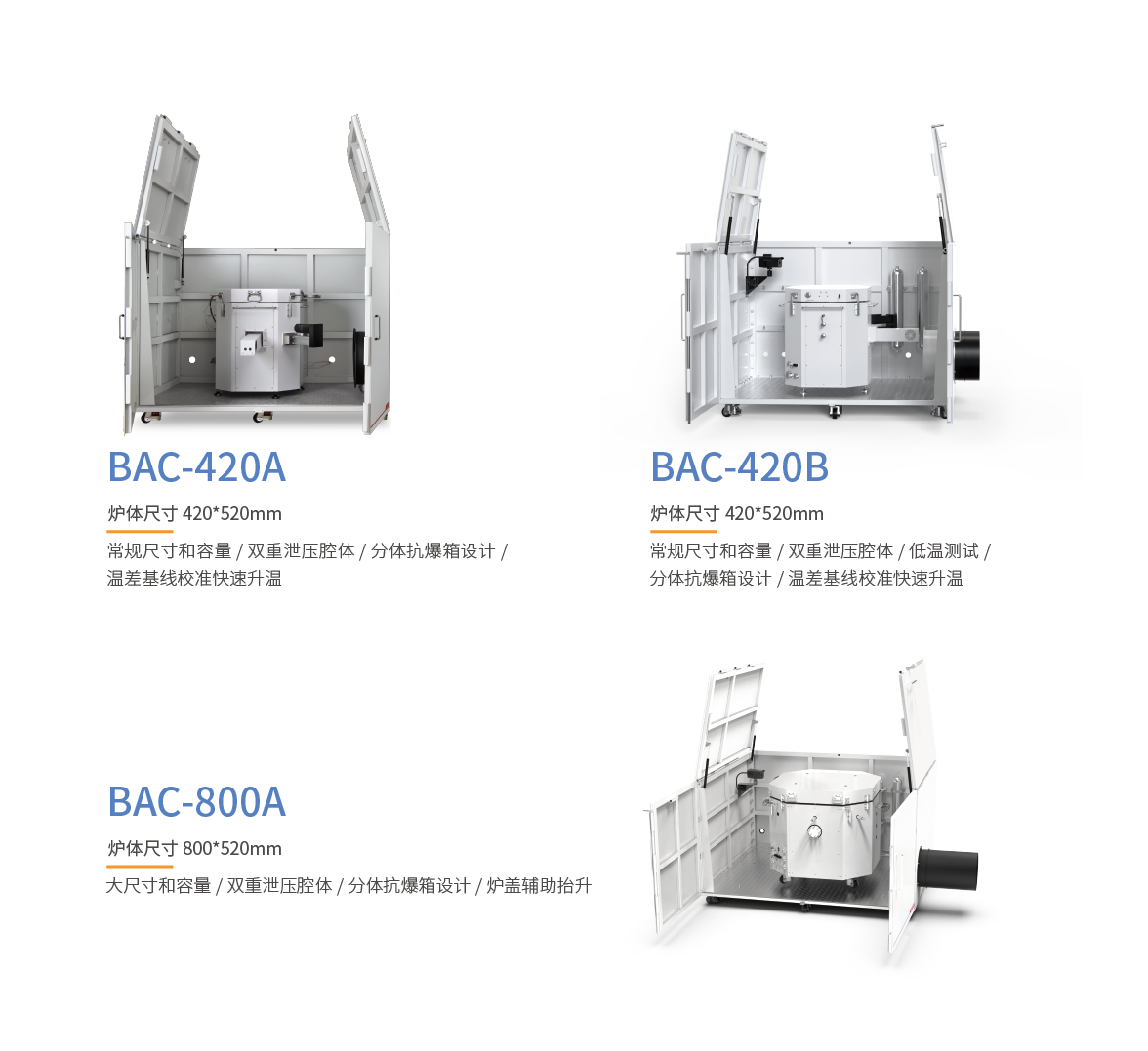 產(chǎn)品型號(hào)包含BAC-420A、BAC-420B和BAC-800A,保留了經(jīng)典ARC使用習(xí)慣。儀器結(jié)構(gòu)總體分為絕熱腔體、抗爆箱與電控系統(tǒng)三部分。泄壓型系列具備優(yōu)異的多重安全防護(hù)能力,利用彈簧鎖設(shè)計(jì),當(dāng)內(nèi)部壓力過高時(shí)爐蓋可彈起進(jìn)行快速泄壓,同時(shí)腔體內(nèi)部安裝爆破片進(jìn)行防護(hù)??贡涫褂脵C(jī)械安全聯(lián)鎖裝置,鋼板厚度 3.5mm,并安裝大流量排風(fēng)系統(tǒng)確保實(shí)驗(yàn)安全。