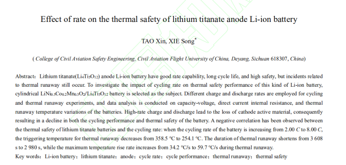 為了深入探究不同充放電倍率對(duì)鈦酸鋰負(fù)極鋰離子電池?zé)岚踩挠绊?,中國民用航空飛行學(xué)院安全工程學(xué)院謝松老師課題組利用BAC-800A大電池絕熱量熱儀,對(duì)鈦酸鋰負(fù)極鋰離子電池在不同循環(huán)倍率下的熱失控行為進(jìn)行了詳盡的測(cè)試與分析。此次研究通過系統(tǒng)分析電化學(xué)特征參數(shù)與熱失控特征參數(shù),揭示了充放電倍率對(duì)鈦酸鋰電池?zé)岚踩阅艿膬?nèi)在影響機(jī)制。相關(guān)研究結(jié)果已發(fā)表在《電池》期刊,該成果由四川省重點(diǎn)研發(fā)計(jì)劃(2022YFG0236)、 四川省重點(diǎn)實(shí)驗(yàn)室自主項(xiàng)目(MZ2022JB02)支持。