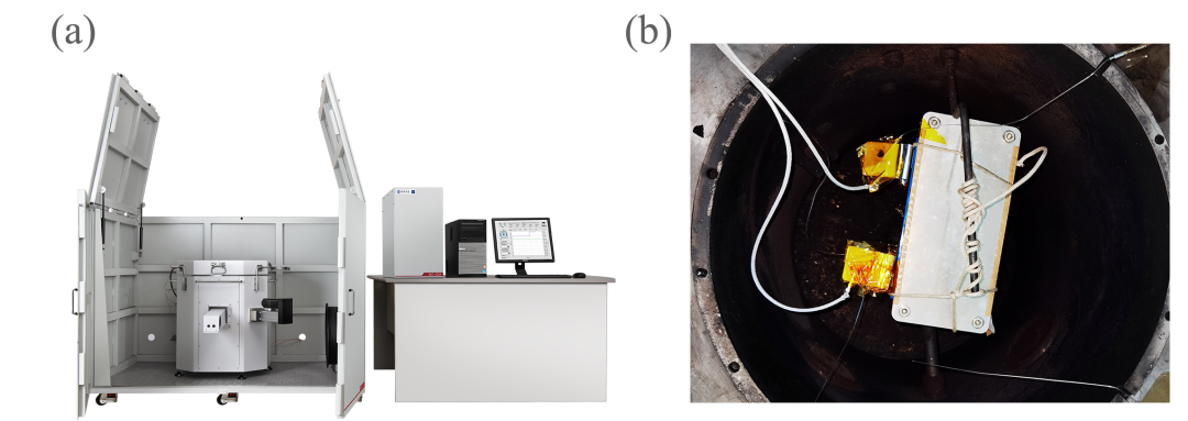 圖1 (a)BAC-420A大型電池絕熱量熱儀和(b)電池樣品安裝示意圖