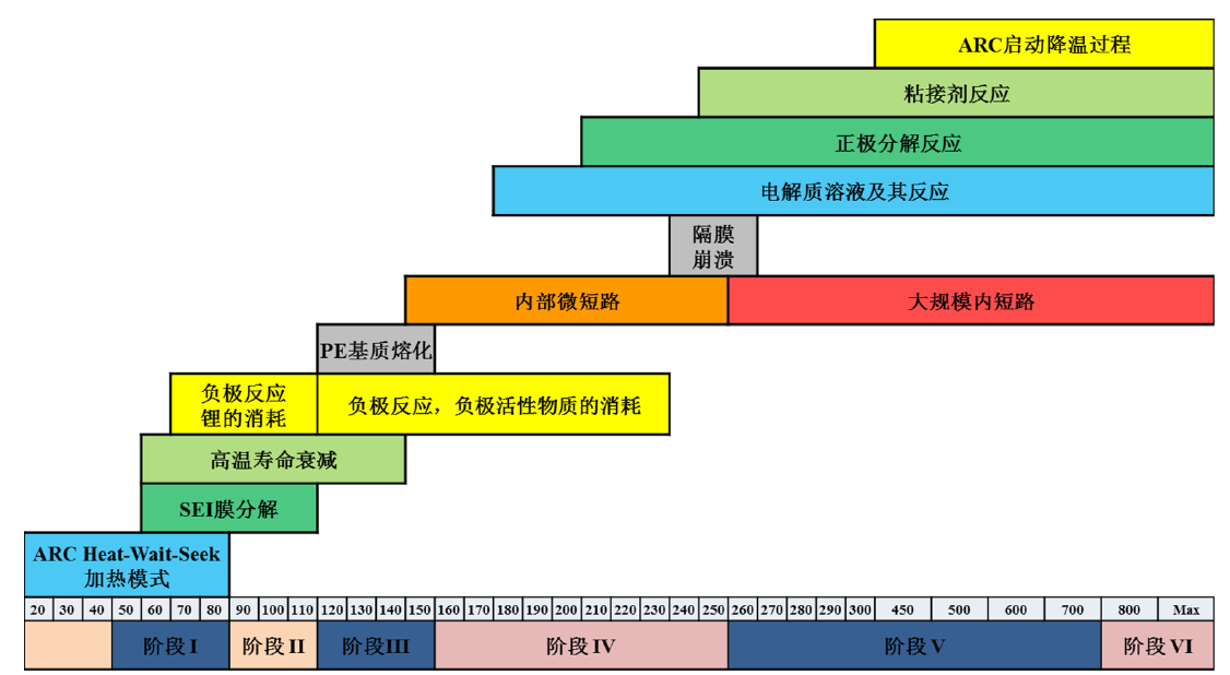 圖1 絕熱熱失控測試各個階段發(fā)生的化學反應情況