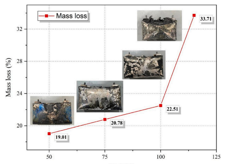 對熱失控后的電池殘骸進行稱量,可計算質(zhì)量損失率。該方法同樣能夠判斷電池熱失控劇烈程度。從圖2可以發(fā)現(xiàn),SOC越高,電池的質(zhì)量損失率越大,這是由于高SOC的電池在熱失控過程中通常伴隨更強烈的電池材料噴發(fā)、起火和燃爆現(xiàn)象。