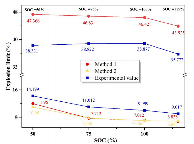圖5 不同SOC電池熱失控后氣體爆炸上下限