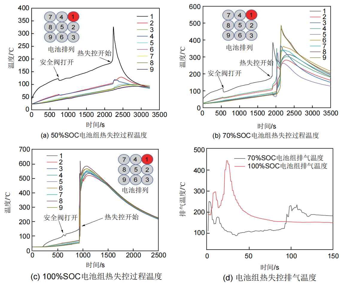 在實際應用中,鋰電池通常會以電池組的形式進行使用,此時若有一個電池發(fā)生熱失控,可能逐步引發(fā)周圍電池的熱失控,從而出現(xiàn)熱蔓延現(xiàn)象。本文引用中國民航大學的張青松課題組的研究成果[2],觀察圖7可發(fā)現(xiàn),50%SOC的電池組除1號電池以外,其余電池均未發(fā)生熱失控;而70%及100%電池組中的所有電池均相繼發(fā)生了熱失控。其中100%SOC 條件下,熱蔓延速度、電池熱失控最高溫度和電池組排氣溫度均高于70%SOC,這也充分說明滿電電池無論是熱失控劇烈程度還是發(fā)生熱蔓延的概率都明顯高于空電狀態(tài)電池。