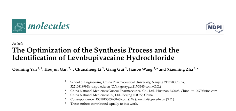 中國藥科大學(xué)工學(xué)院查曉明教授團隊在Journal | [J] Molecules(IF:4.2)發(fā)表題為The Optimization of the Synthesis Process and the Identification of Levobupivacaine Hydrochloride論文,該成果由中國藥科大學(xué)工學(xué)院、國藥集團國瑞藥業(yè)有限公司及中國民族醫(yī)藥股份有限公司等機構(gòu)聯(lián)合支持。