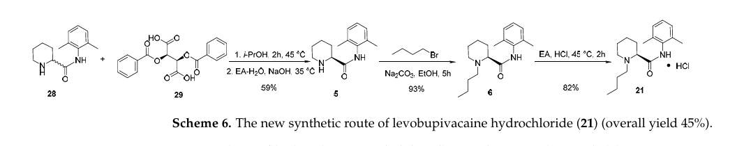 本研究從起始原料的可用性和成本效益、操作簡便性、綠色環(huán)保、設(shè)備可及性、工業(yè)化可行性、優(yōu)化的手性合成和安全性等維度考慮,優(yōu)化和改進了一種更可行的鹽酸左布比卡因(21)合成工藝(Scheme 6),這種新方法能克服現(xiàn)有方法的復(fù)雜性和高成本,有利于促進大規(guī)模工業(yè)化生產(chǎn)。