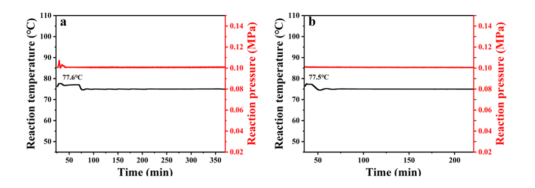 1.使用反應(yīng)量熱法,在兩組反應(yīng)條件下,反應(yīng)過程中均未觀察到明顯的放熱或壓力升高。兩組反應(yīng)的最大反應(yīng)溫度分別為77.6°C和77.5°C,均低于溶劑的沸點。
